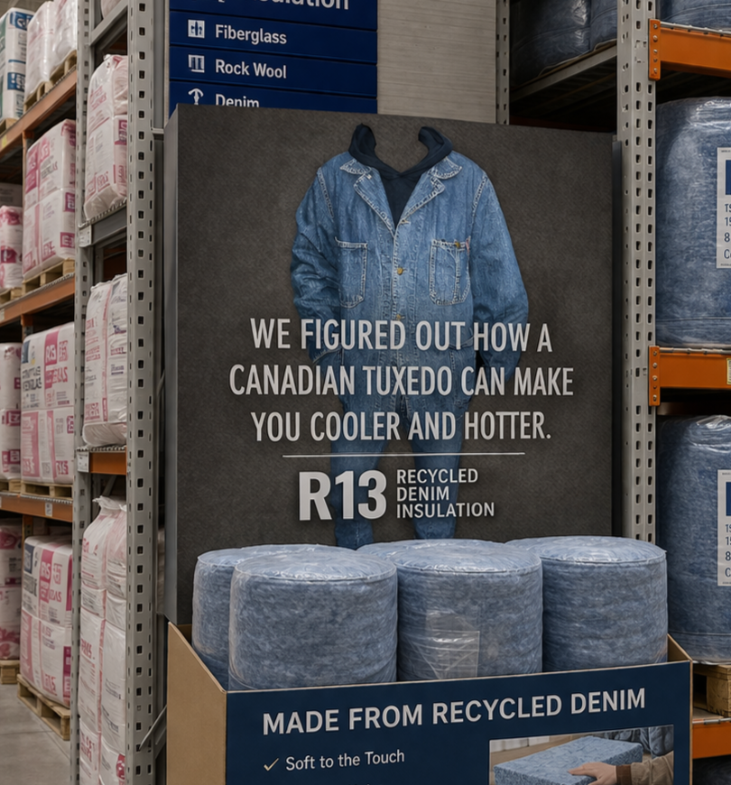 Endcap display ads showing people how they can give old denim new life by putting it in their walls.